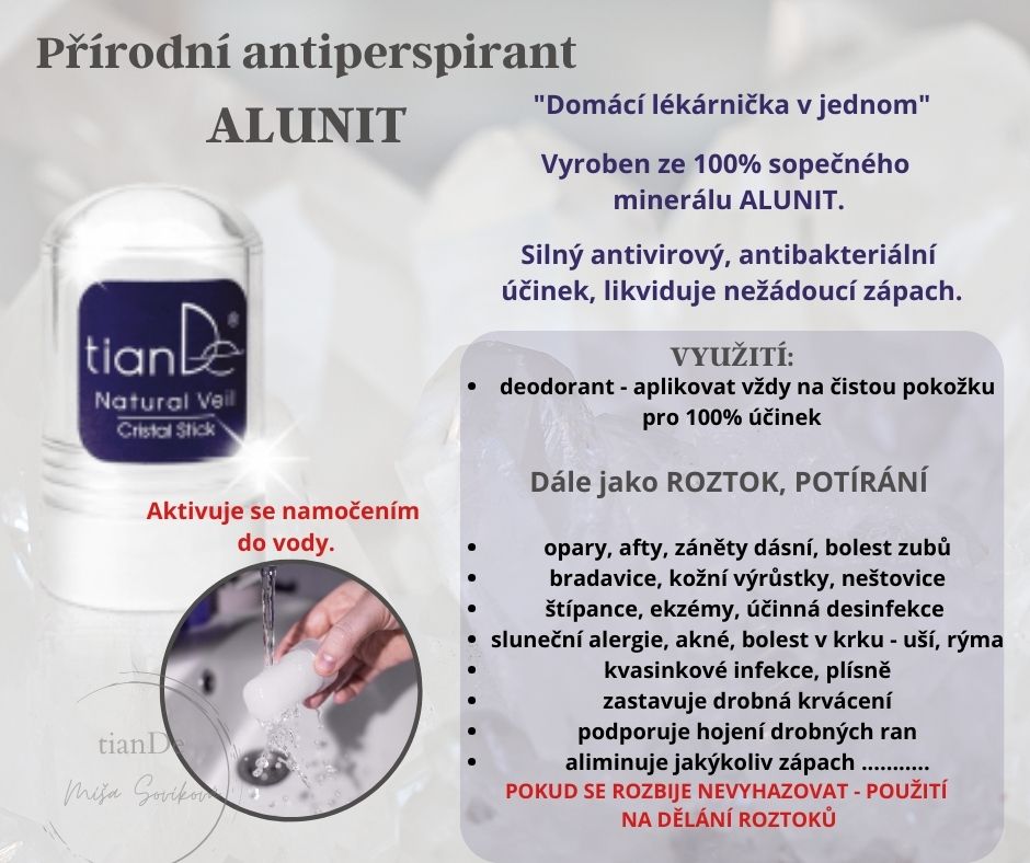Alunit tvoří 100% minerál Alunit, je netoxický, bez barviv a parabenů, neobsahuje chlorhydrát hliníku, bez aluminiových solí, bez parfemace. Je vyroben z jednoho kusu - není lepený, proto jej můžeme používat i jako roztok k ošetření v ústech, na poranění. Eliminuje množení bakterií na pokožce a tím brání nepříjemnému zápachu, navíc póry lehce stahuje, tím snižuje produkci potu, pokožka dýchá, to je důležité. Nezanechává žádné stopy na oblečení, protože se rychle vstřebá a nelepí se. Proto je vhodný pro alergiky, astmatiky, těhotné i kojící ženy, pro všechny bez rozdílu věku i pohlaví.